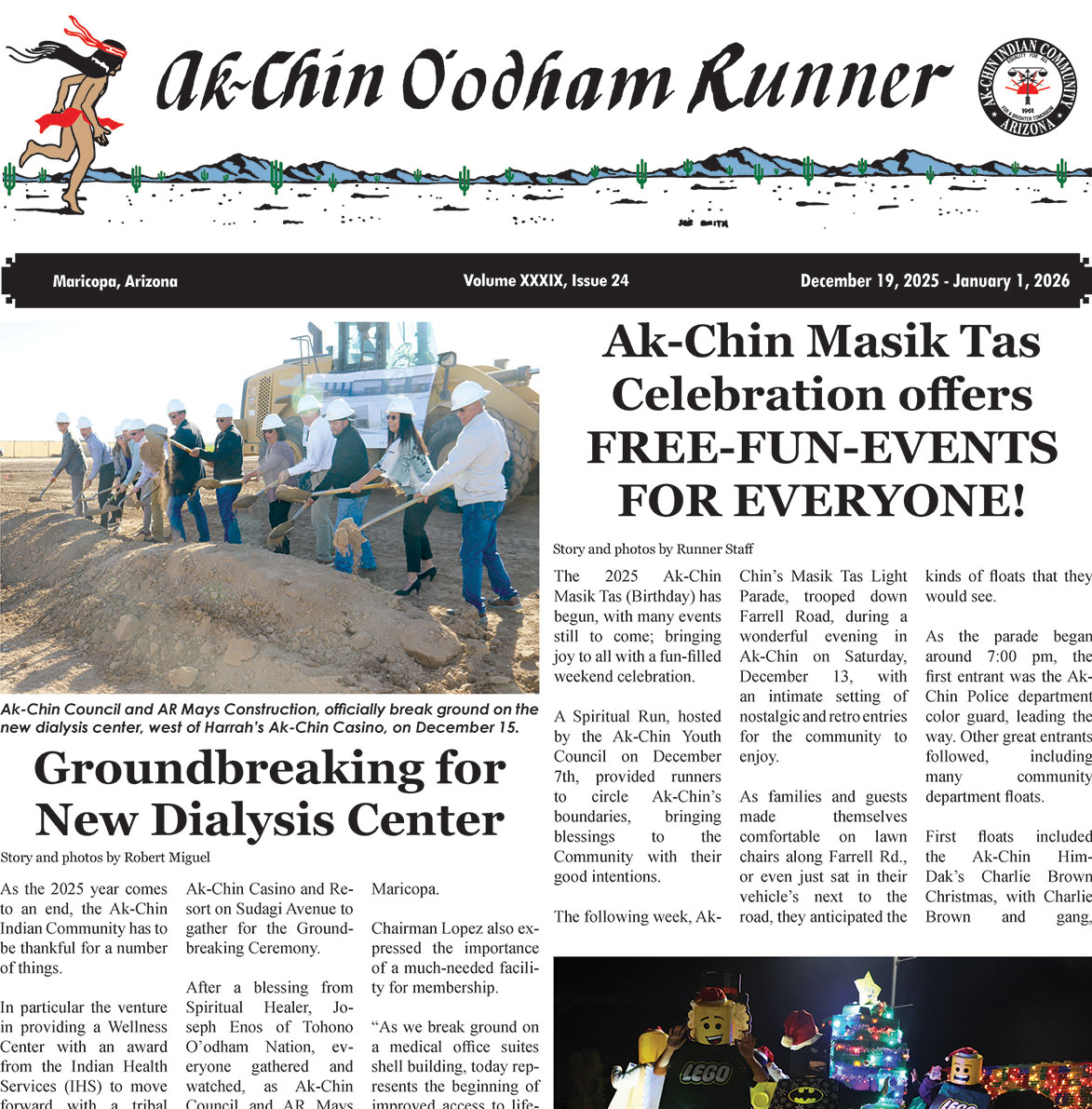 The Ak-Chin O’odham Runner is published on the first and third Friday of each month. The “Runner” is delivered to all residents and departments of the Ak-Chin Indian Community, as well as surrounding community businesses, interested groups and subscribers. All information and original work contained in this newspaper is copyright and may not be reproduced without written permission from: