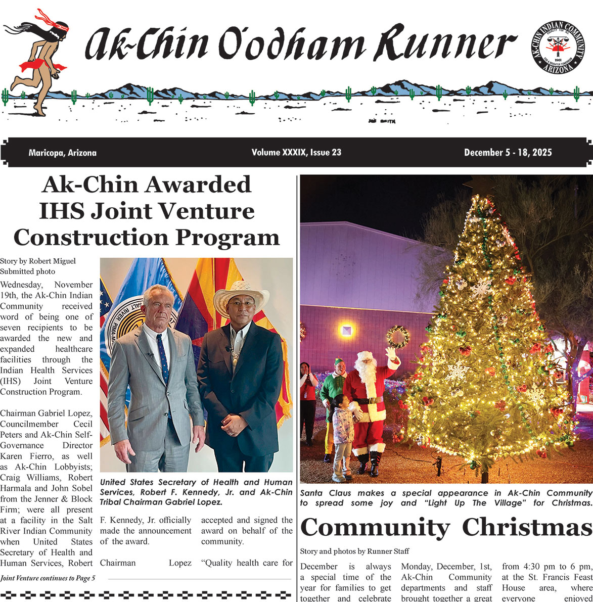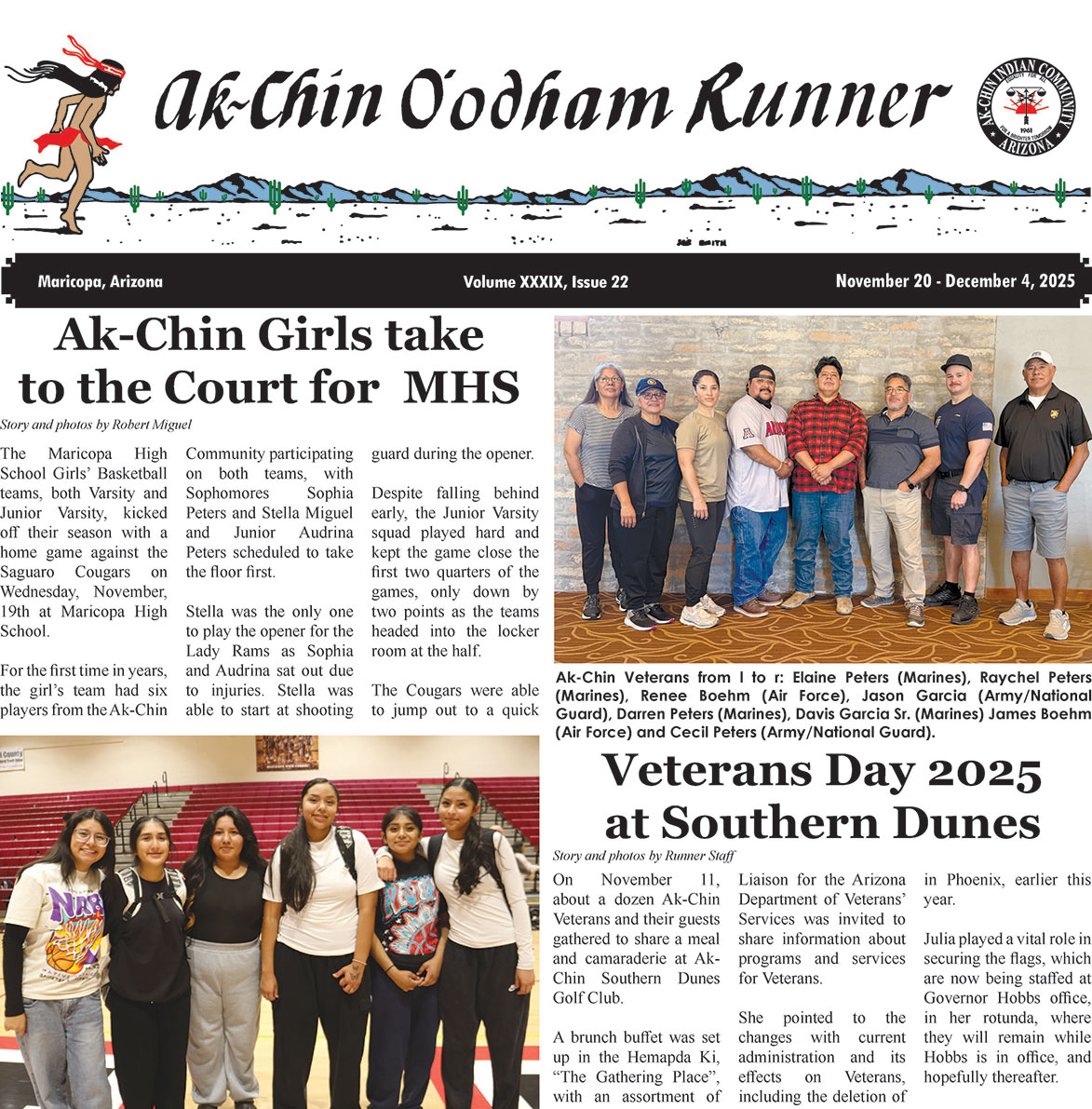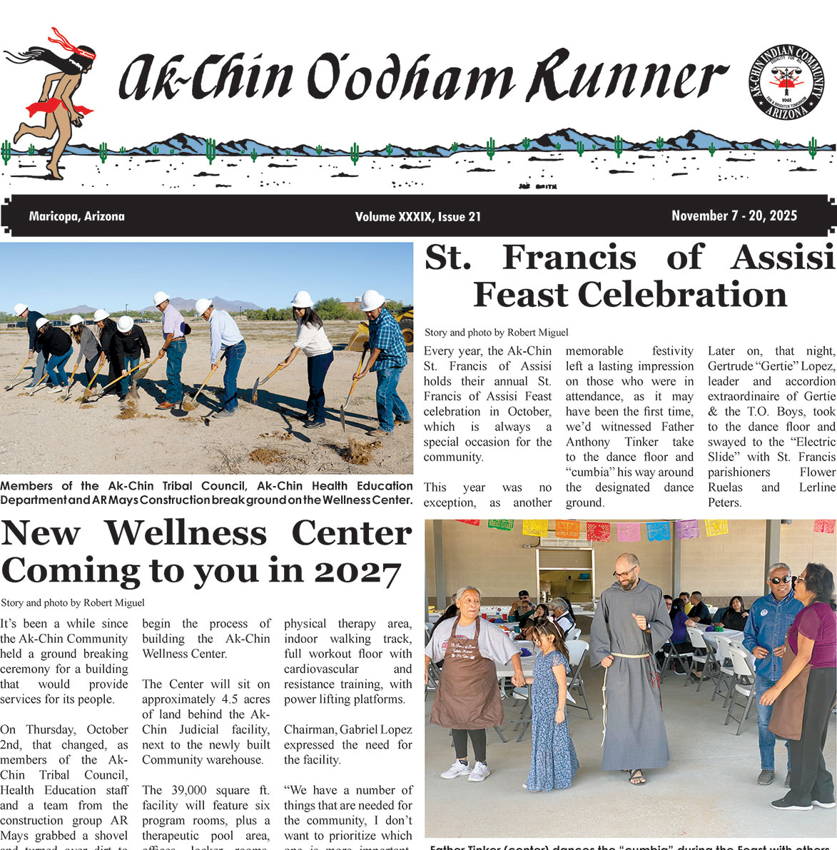 The Ak-Chin O’odham Runner is published on the first and third Friday of each month. The “Runner” is delivered to all residents and departments of the Ak-Chin Indian Community, as well as surrounding community businesses, interested groups and subscribers. All information and original work contained in this newspaper is copyright and may not be reproduced without written permission from: